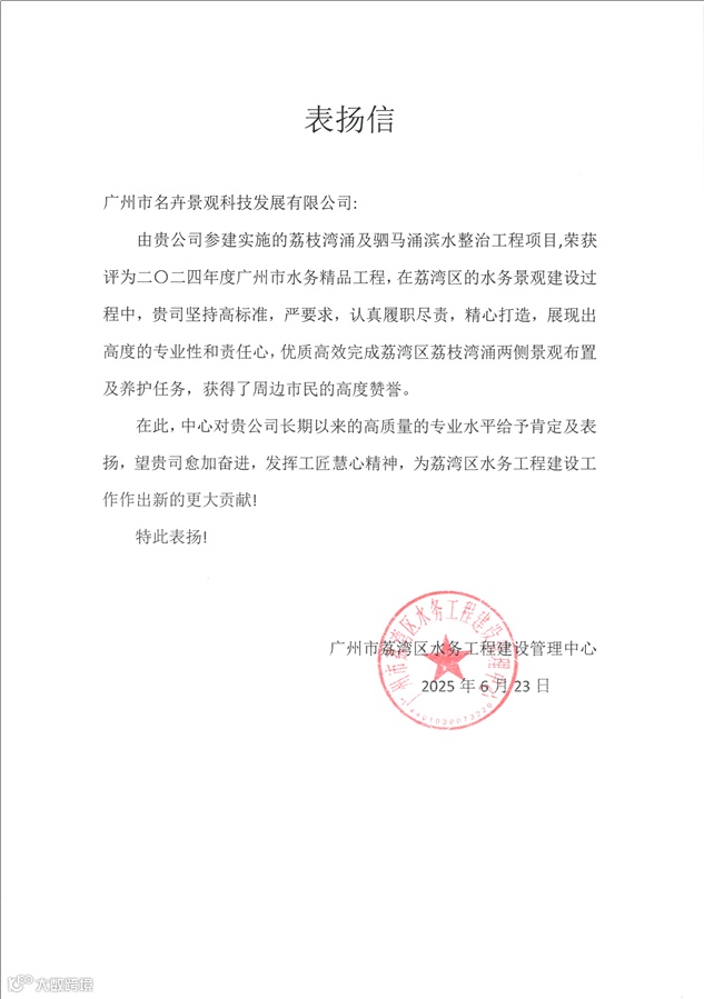 ▲广州市荔湾区水务工程建设管理中心表扬信