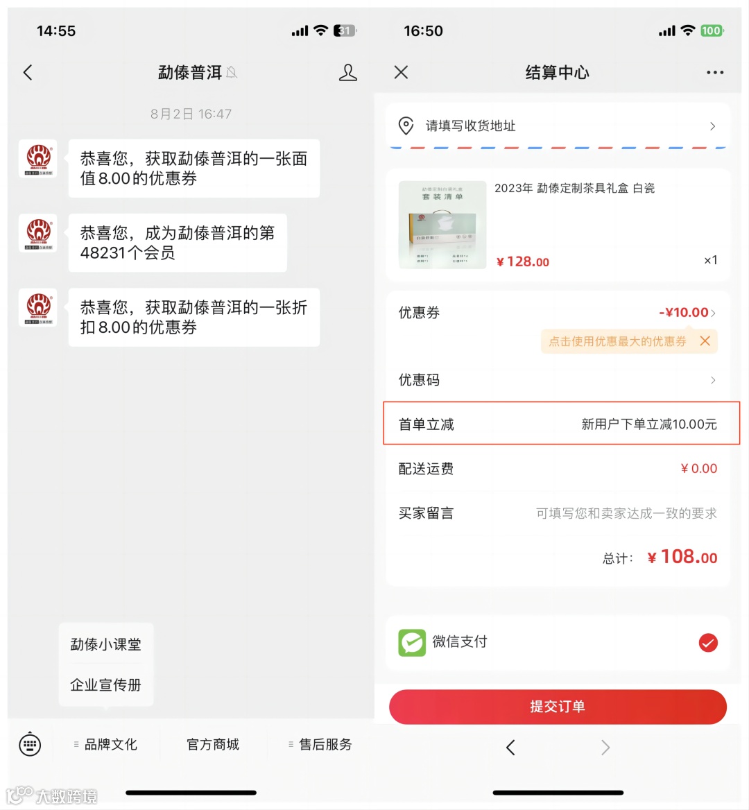 关注“勐傣普洱”公众号将会获取1张8元的优惠券,首次关注送优惠券动作的背后承载着提高首单转化和会员开卡可能性。