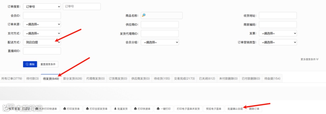 功能描述:总部订单列表筛选待发货且配送方式为自提时,底部可批量确认自提
