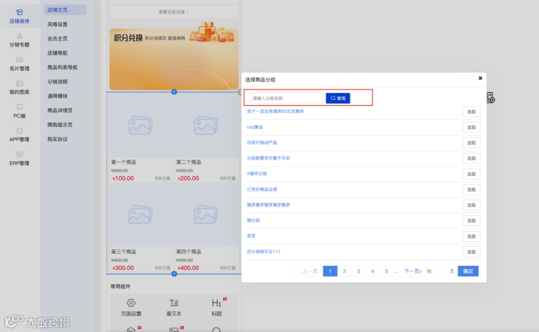 功能描述:首页装修的商品分组组件选择分组时可快速筛选