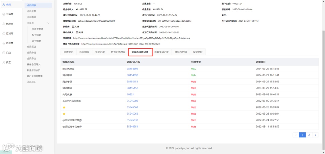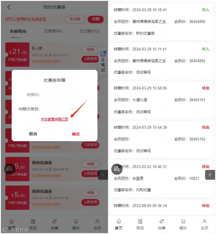 系统后台会员详情新增优惠券转赠记录