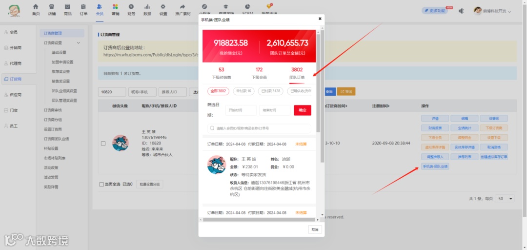 订货商管理列表新增【手机端-团队业绩】操作按钮,商家可通过在此处点击查看订货商业绩情况