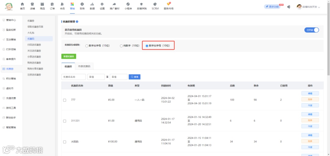 新增优惠码生成规则添加10位 数字加字母的方式
