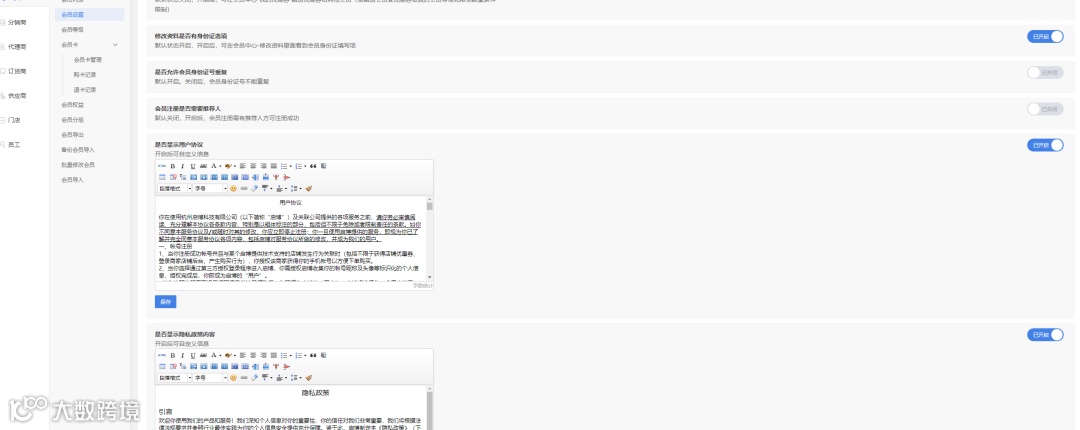 后台开启后,用户可在H5(非微信、小程序环境)注册页面、会员中心查看详细协议内容和操作注销账户。
