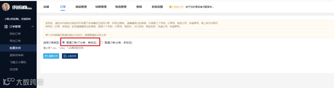 供应商发货功能开启后,供应商后台批量发货,两种模式下都支持.csv、.xlxs、.xls格式文件导入发货