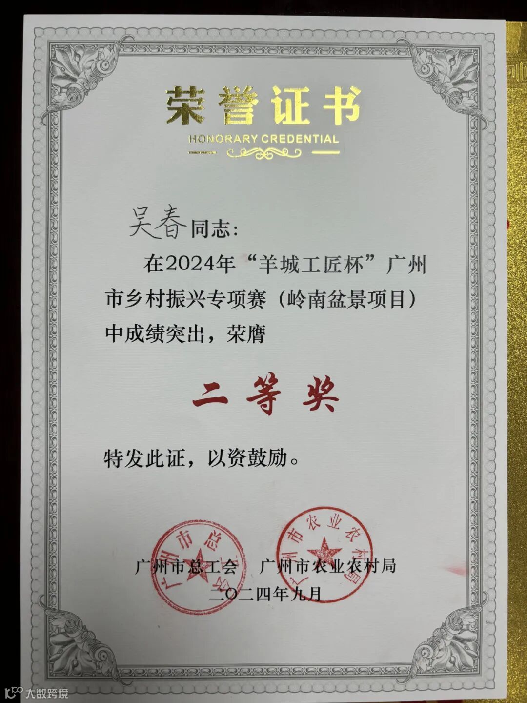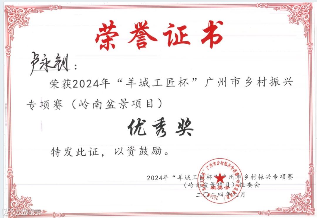 9月29日上午,由广州市总工会、广州市农业农村局主办的2024年“羊城工匠杯”广州市乡村振兴专项赛(岭南盆景项目)在花都区成功举办,名卉公司派出3名员工参赛,其中,吴春从众多选手中脱颖而出,最终荣获二等奖,卢永钊、吕江江分别获得优秀奖。
