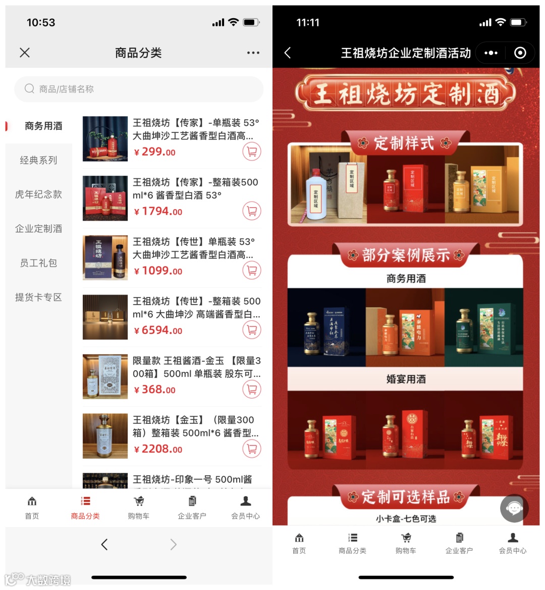 王祖烧坊合作启博微分销,同时部署了小程序商城和h5微商城,商品、会员、订单等数据互通,商城分布统一都是“首页”、“商品分类”、“购物车”、“企业客户”、“会员中心”五大模块构成。