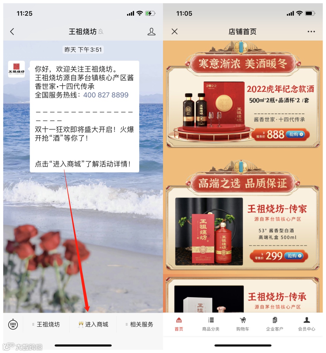 关注「王祖烧坊」公众号后,在自动欢迎语中引导用户点击菜单栏“进入商城”直接下单。