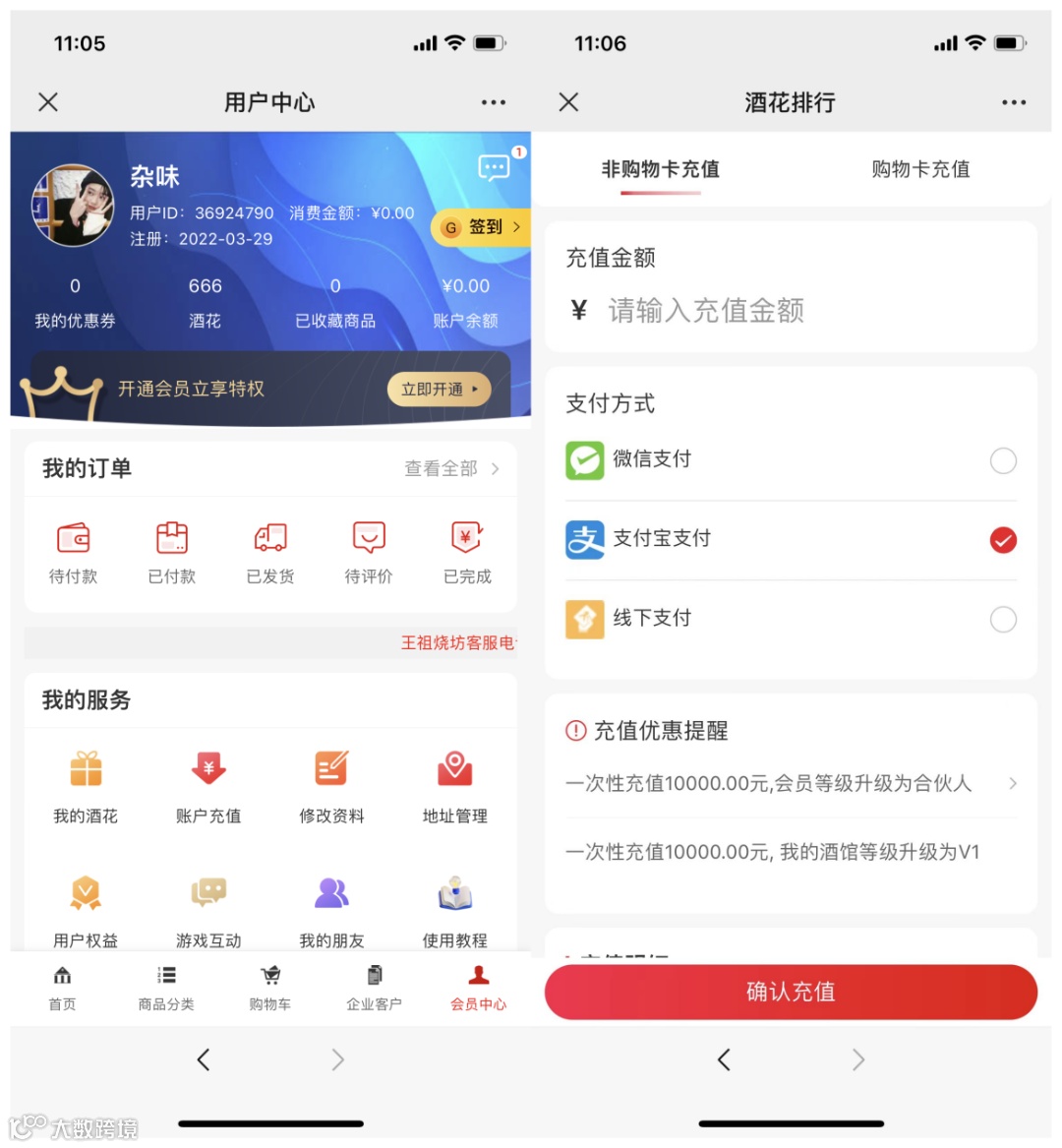 王祖烧坊小程序/微商城除了通过上线各种促销活动提升商城流量转化外,还在商城内招募分销商、代理商,用户购买指定礼包即可升级为商城VIP,或者充值指定金额升级会员等级,在自营的同时,发动更多的人一起共同创业,还无需承担发货、物流等问题,为商城带来更多销量。
