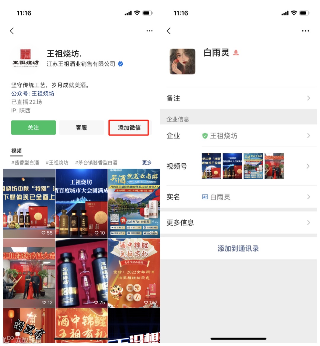 结合线上小程序商城,「王祖烧坊」也进一步将公众号、视频号实现了触达、沟通、转化的一体化全链路经营闭环。也将品牌资源优势充分放大,助力用户深度沉淀,为用户提供更加近距离的交互。在视频号「王祖烧坊」的主页内设置福利官「白雨灵」的企微,引导进入小程序商城。