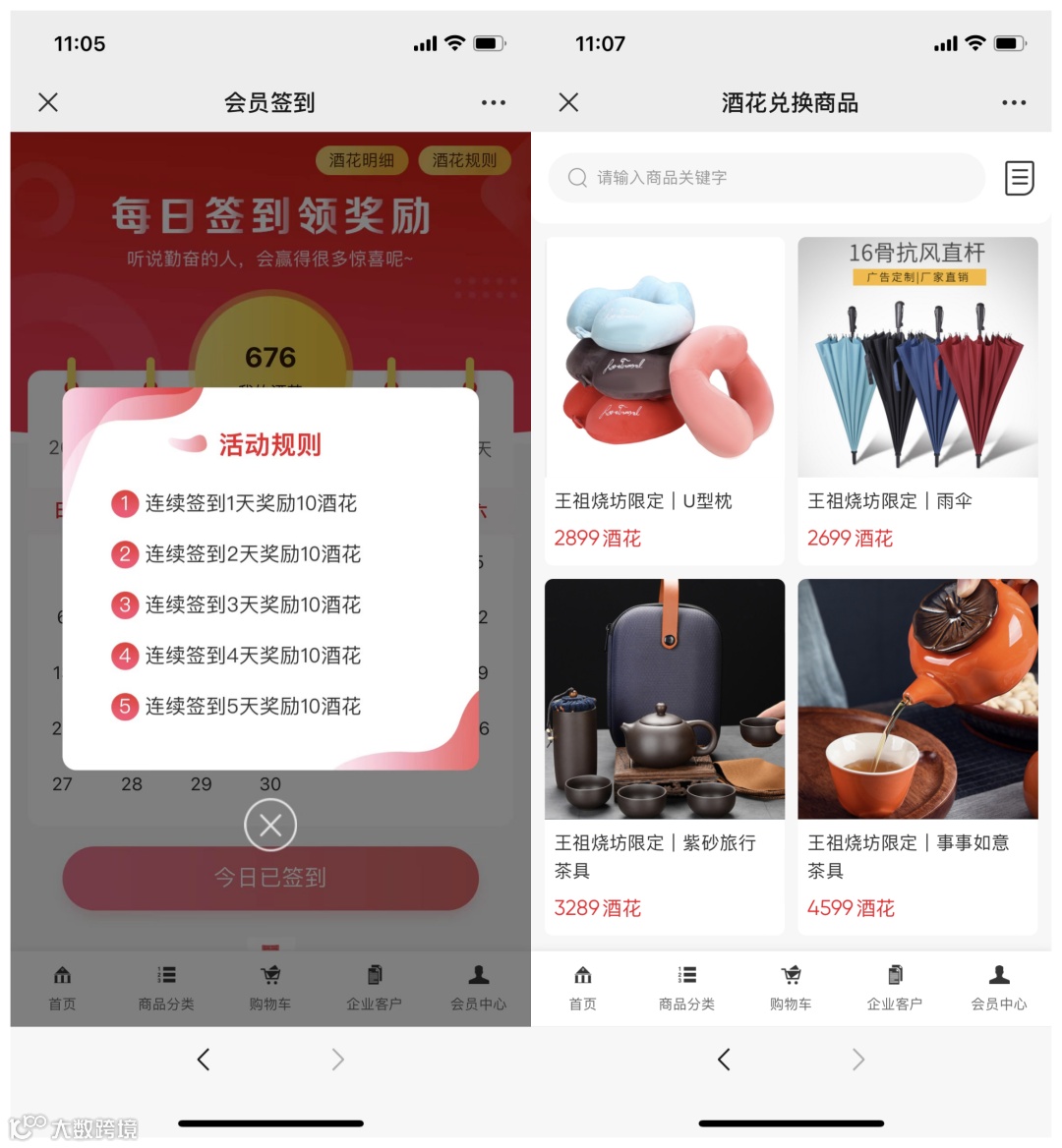 在白酒商品之外,王祖烧坊把低客单、复购高的生活用品:如U型枕、雨伞等引入到线上商城,再通过上线签到打卡、萝卜精灵游戏、下单赠酒花(积分)等营销玩法,提升客户的进店频次,同时酒花(积分)还能兑换该类商品。