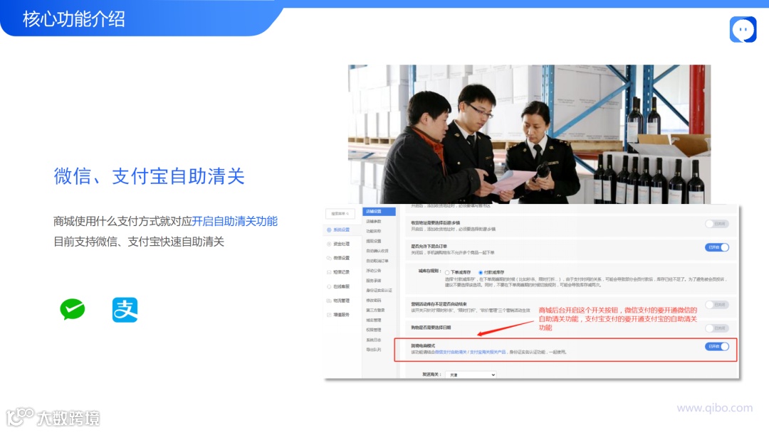 商城使用什么支付方式就对应开启自助清关功能,目前支持微信、支付宝快速自助清关。