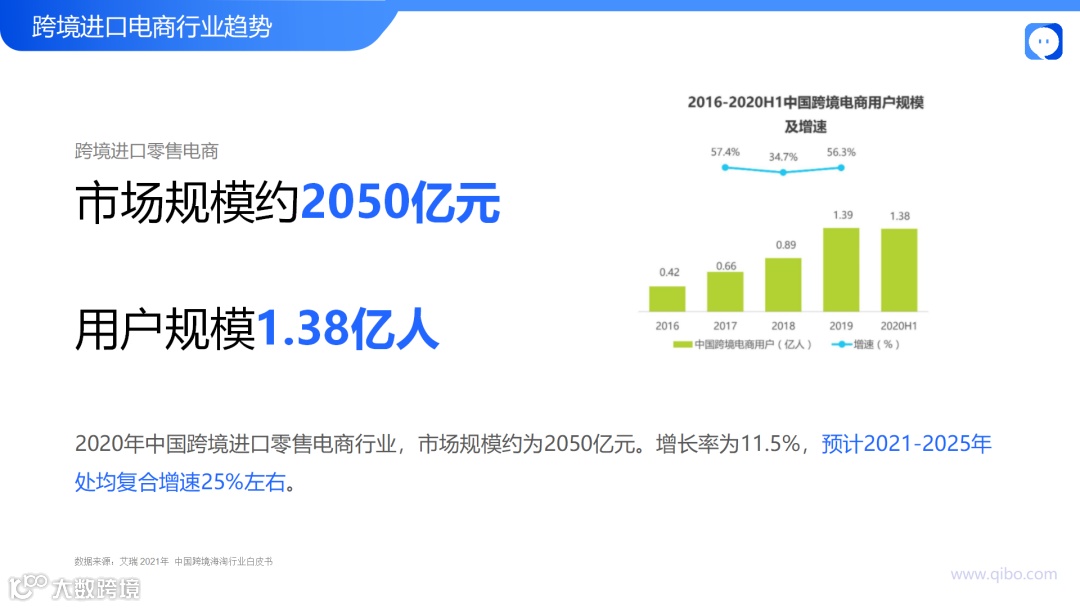 2020年中国跨境进口零售电商行业,市场规模约为2050亿元。增长率为11.5%,预计2021-2025年处均复合增速25%左右。