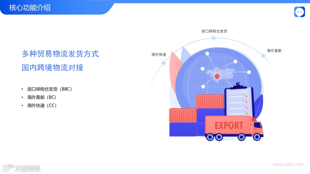 启博微分销跨境电商系统支持多种贸易物流发货方式和国内跨境物流对接,包括进口保税仓发货(BBC)、海外直邮(BC)、海外快递(CC)。