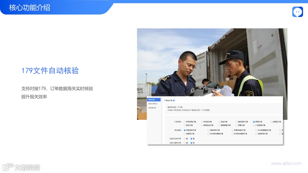 支持对接179,订单数据海关实时核验,提升报关效率。