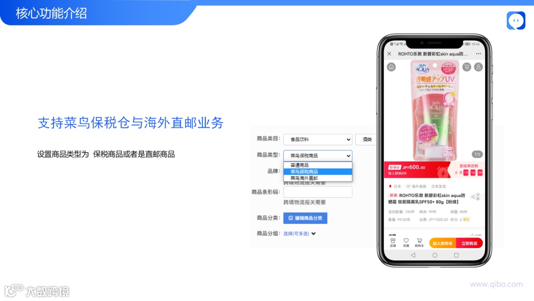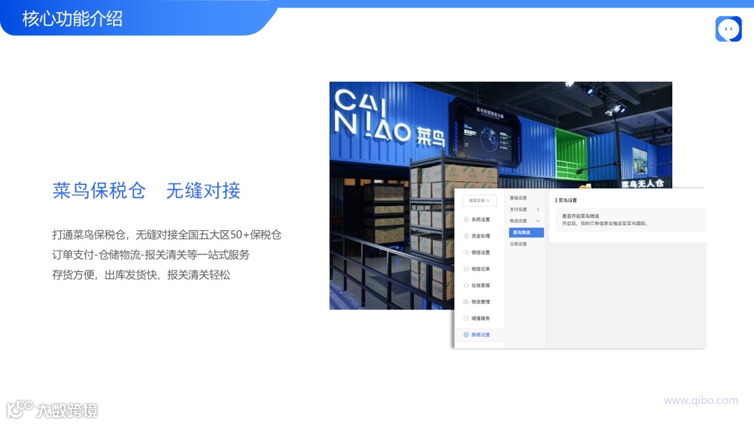启博微分销跨境电商系统已打通菜鸟保税仓,可无缝对接全国五大区50+保税仓,实现订单支付-仓储物流-报关清关等一站式服务,存货方便,出库发货快、报关清关轻松。