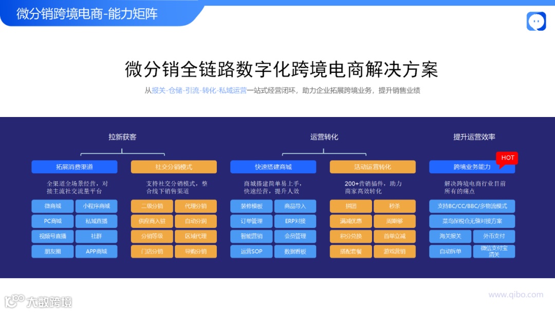 启博微分销跨境电商系统集齐了“人、货、场”生态服务能力,为商家提供一站式跨境电商数字化解决方案。