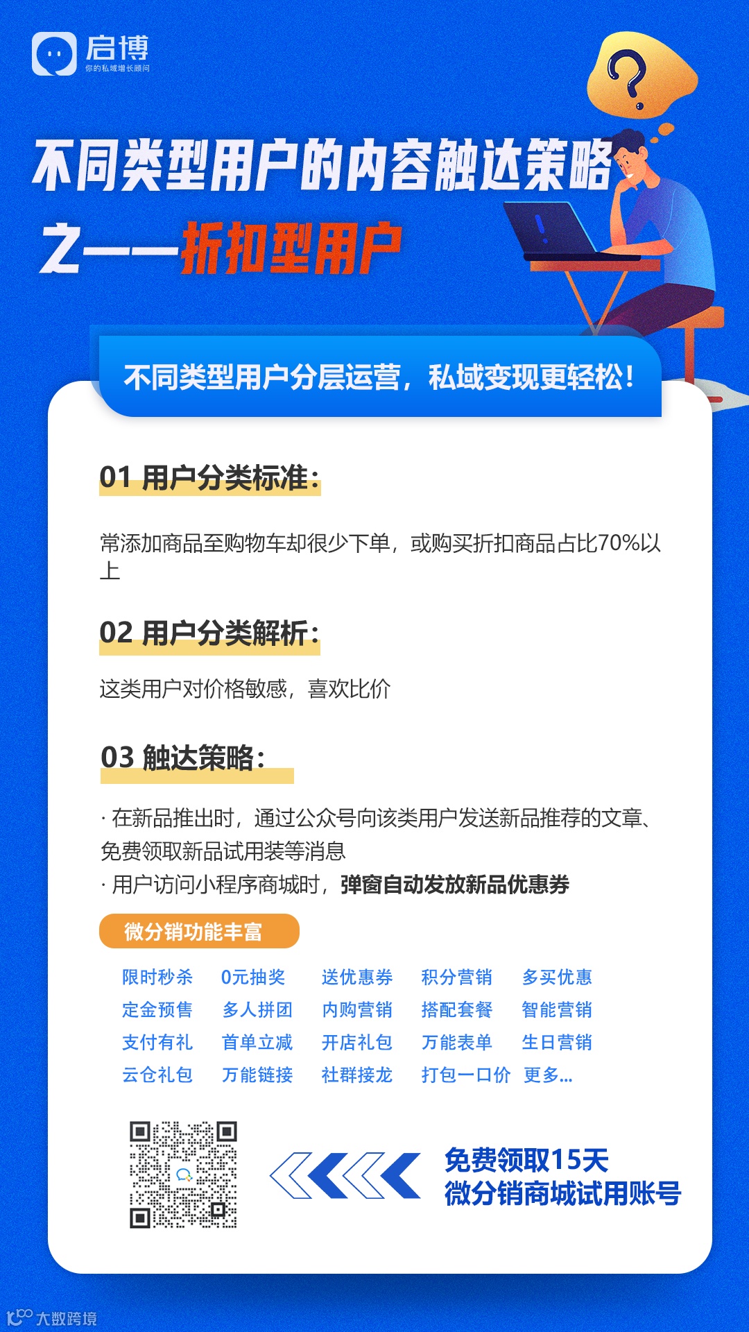 启博发布的《2023企业私域运营实战地图》,从引流、客户运营、运营增长三个维度分享了公众号+小程序+视频号+企业微信矩阵组合运营实战方法。添加下方启宝企微,回复关键词:运营图谱,即可免费领取实战地图!