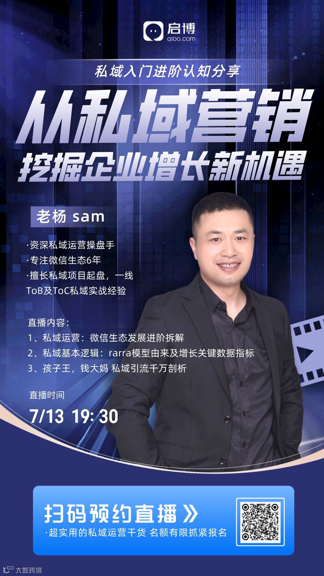具体怎么做?7月13日(本周四)晚19:00,启博携大家一起走进启博私域增长顾问视频号直播间,为大家带来「私域入门进阶认知分享——从私域营销挖掘企业增长新机遇」的主题分享。
