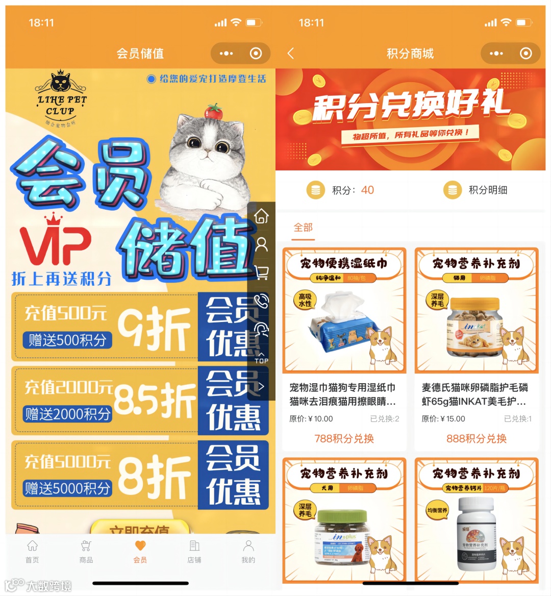励合宠物把低客单、复购高的商品,展示在积分商城,通过消费赠积分,消费者积累积分后兑换指定商品。宠物的口粮、用品等属于消耗品,充值会员卡会比较划算,设置了3重会员卡等级,引导更多客户办理会员卡。