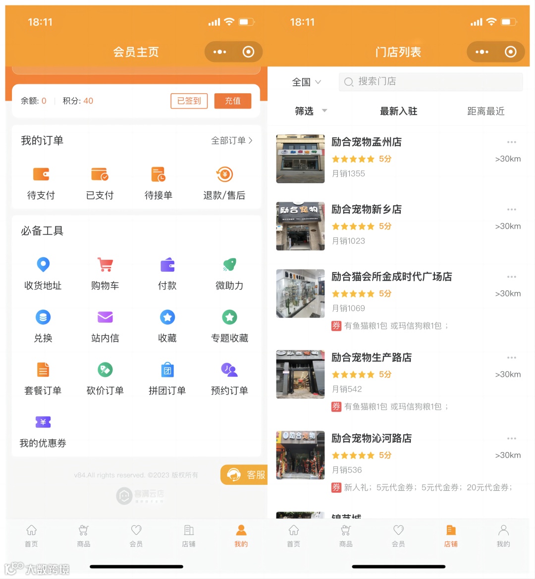 小程序商城内所有非服务类的商品,都支持到店自提或者快递到家,消费者可以自定义选择距离自己最近的励合宠物门店自提。