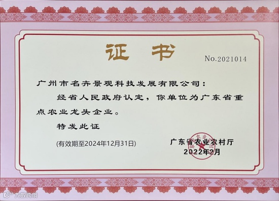 近日,根据《广东省农业农村厅关于公布2021年广东省重点农业龙头企业名单的通知》(粤农农〔2022〕29号)、《广东省林业局关于公布2021年省林业龙头企业名单的通知》(粤林函〔2021〕315号),广州市名卉景观科技发展有限公司获得由广东省农业农村厅、广东省林业局颁发的“广东省重点农业龙头企业”、“广东省林业龙头企业”牌匾及证书,成为广东省内少有的双龙头企业。