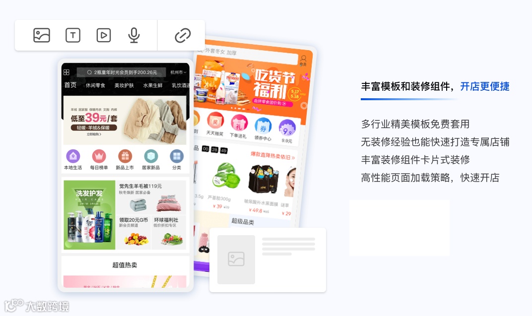 启博微分销系统拥有丰富模板和装修组件,多行业精美模板免费套用,无装修经验也能快速打造专属店铺,丰富装修组件卡片式装修,高性能页面加载策略,快速开店!