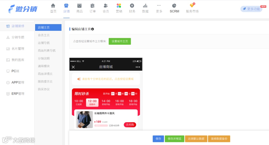 配合“秒杀”活动的预热期,商家可以在后台店铺装修中配置秒杀组件,营造出抢购狂欢的氛围,让每一位进入商城的会员都了解活动。