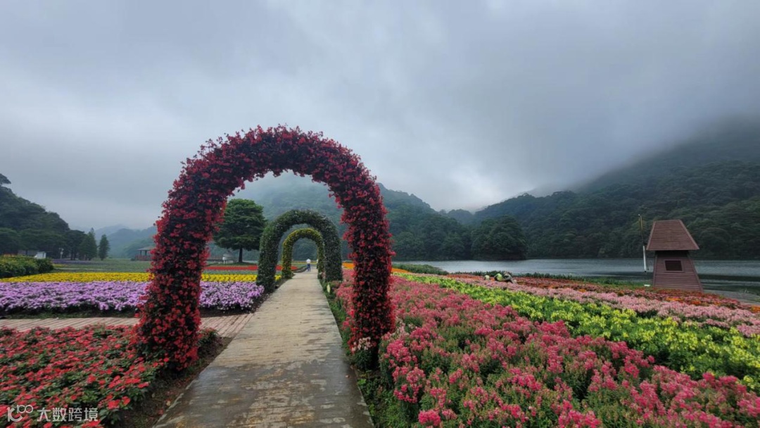 天池花海位于从化区石门国家森林公园石灶景区内海拔800米的高山上,周围有原始次森林的环抱,依山傍水,空气清新,鸟语花香。本次花卉布置的主题是“七彩缤纷花海”。花海面积约16000平方,是广州市内唯一高海拔,大面积的花海。本次使用的时花有一串红,一串蓝,万寿菊,千日红,大花海棠,超级凤仙,金鱼草,醉蝶等9个品种,7种颜色,数量约30万株。花海里还有精心设计的心型、彩虹等图案以及圆拱形动物立体造型,共同营造一个美丽梦幻的“花花世界”,迎接各方游客前来观赏与游玩。
