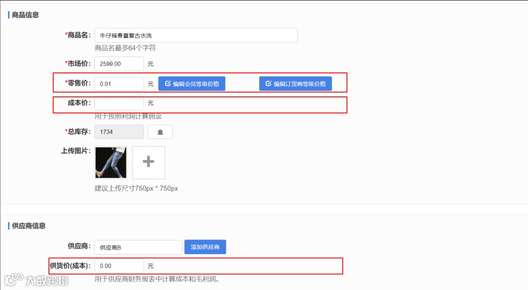 编辑零售价(会员等级价格、订货商等级价格)时,零售价小于成本价或小于供货价是,提示错误【价格小于成本价/供货价】;