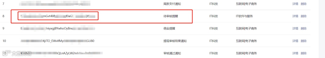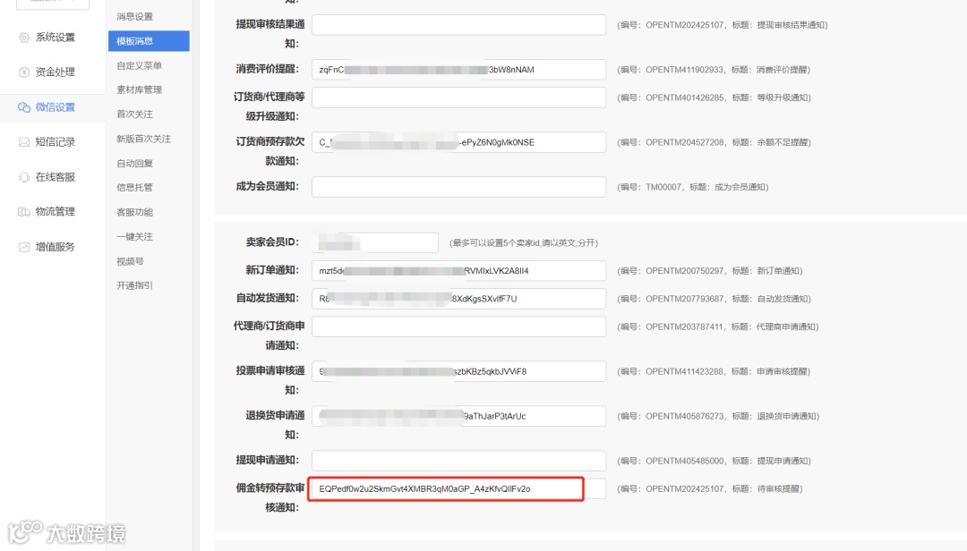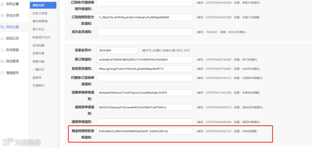 再进入【我的模板】,找到此条模板消息,复制模板ID,粘贴在【微分销后台-设置-微信设置-模板消息-佣金转预存款审核通知】处;