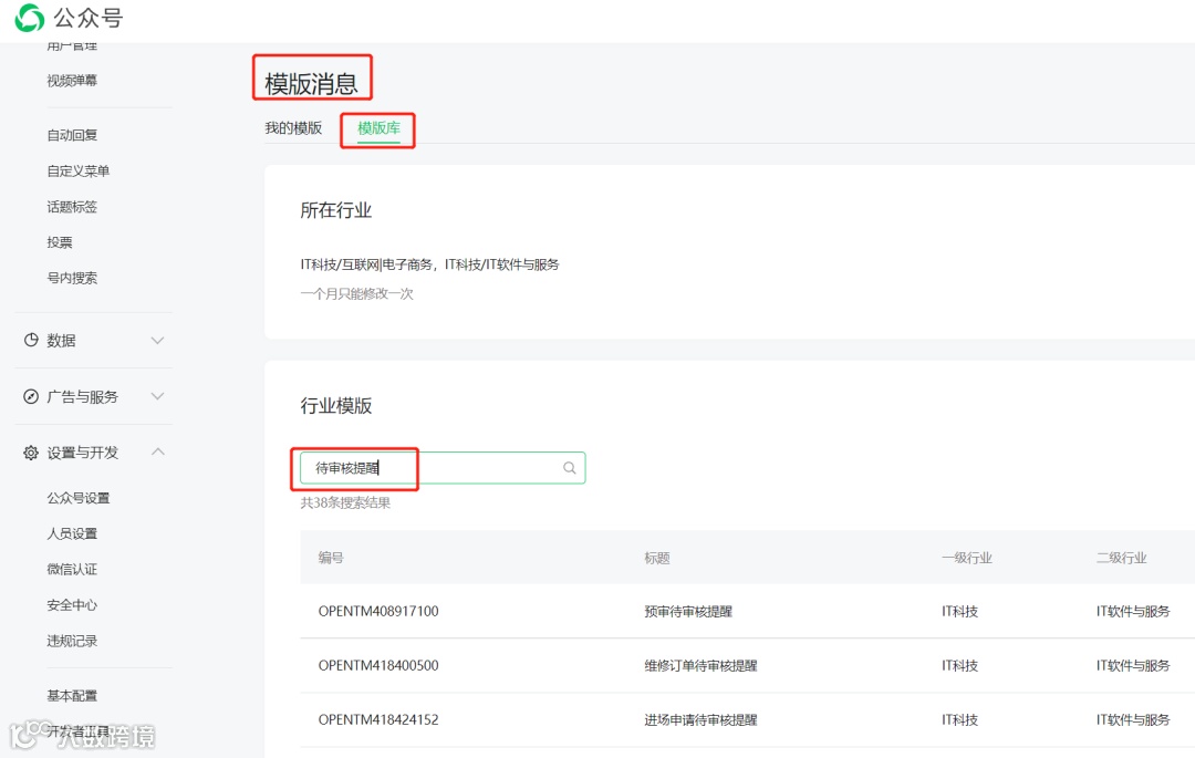 (1)商家首先在微信公众平台进入模板消息配置页面,进入模板库,在行业模板中搜索【待审核提醒】,搜出列表中选择编号为【OPENTM407371770】的模板,点击选择后,进入详情,点击【添加】。