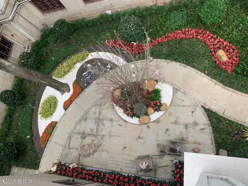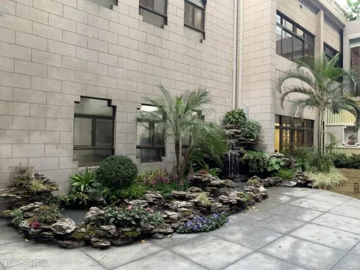 一号楼中庭。营造框景、对景景观,增加景观趣味。增加了假山水景搭配植物组合,增添自然生趣。步道铺装蜿蜒变化,采用水波纹分割线。植物方面保留现有大树,选用玉堂春、山茶花、火山榕等耐阴植物,增添有色彩的地被,植物形成季节性开花的布局,达到色彩景观效果,结合景石,打造精致的庭园景观。