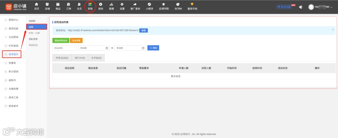 使用启博启小铺系统创建“试用”活动后台入口:商家后台-营销-客单提升-试用(也可以直接“营销中心”首页直接搜索要创建的活动)