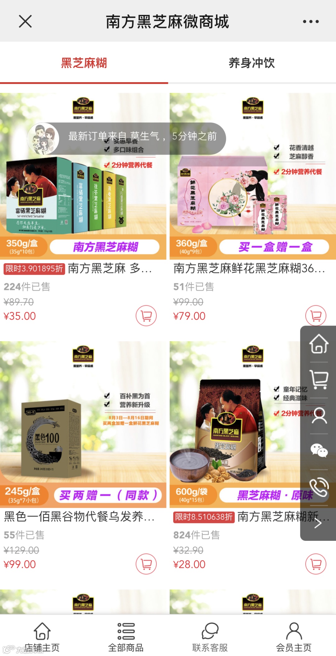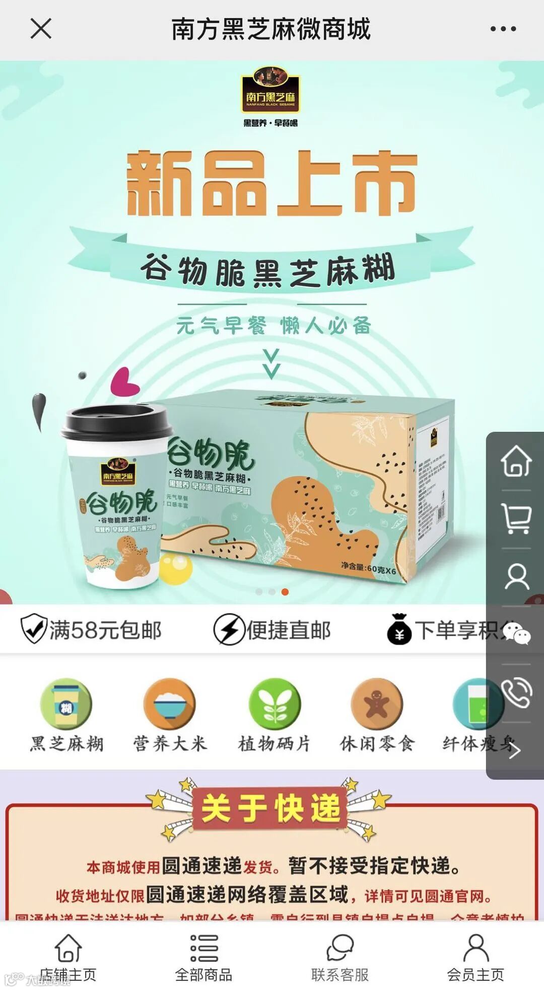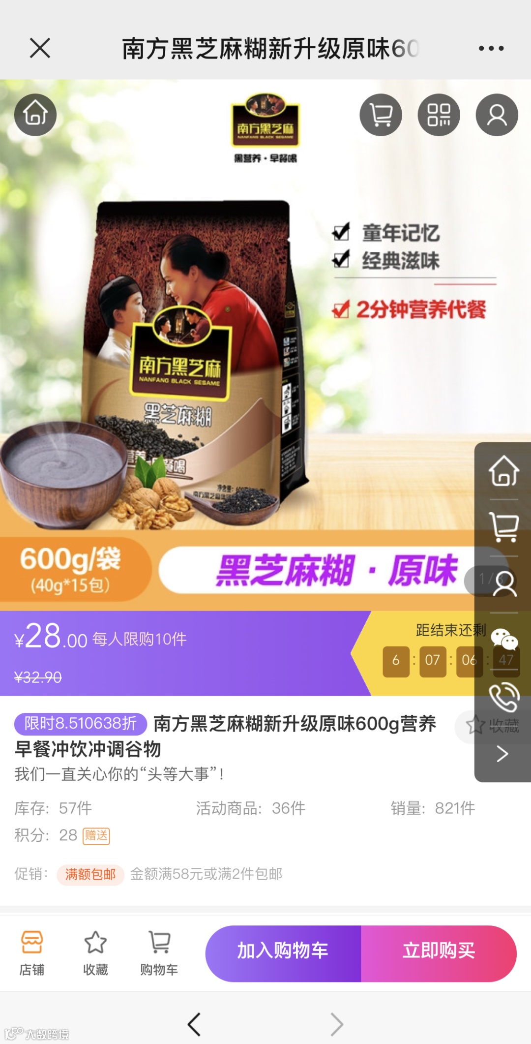 ① 在商城活动中,「南方黑芝麻」通过「满减送」、「优惠券」、「限时折扣」等营销工具,提高客单价,培养用户的购买习惯,促使用户分享,在热销产品上线后,推广到朋友圈更是转化出了大批订单,不仅增加了平台用户粉丝,更是进一步增加平台销量。