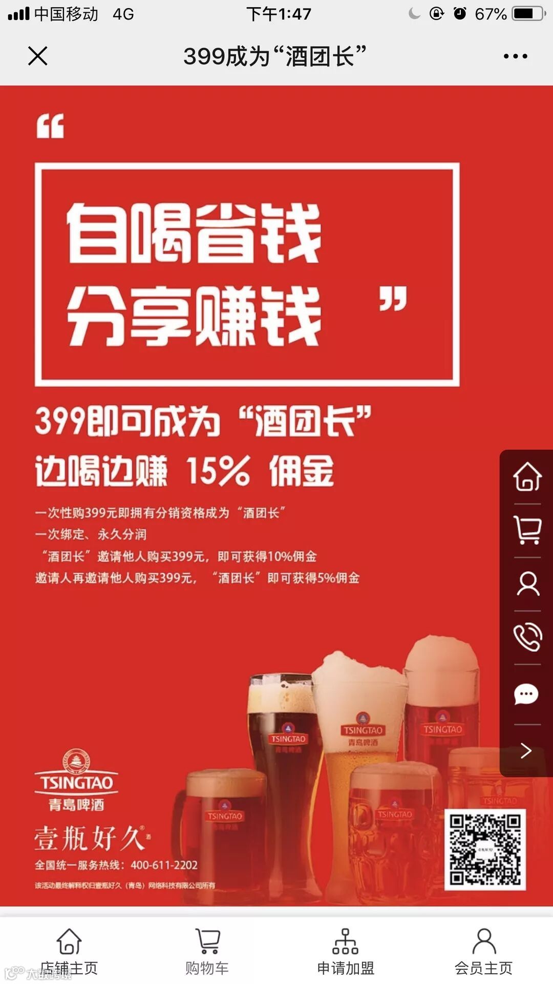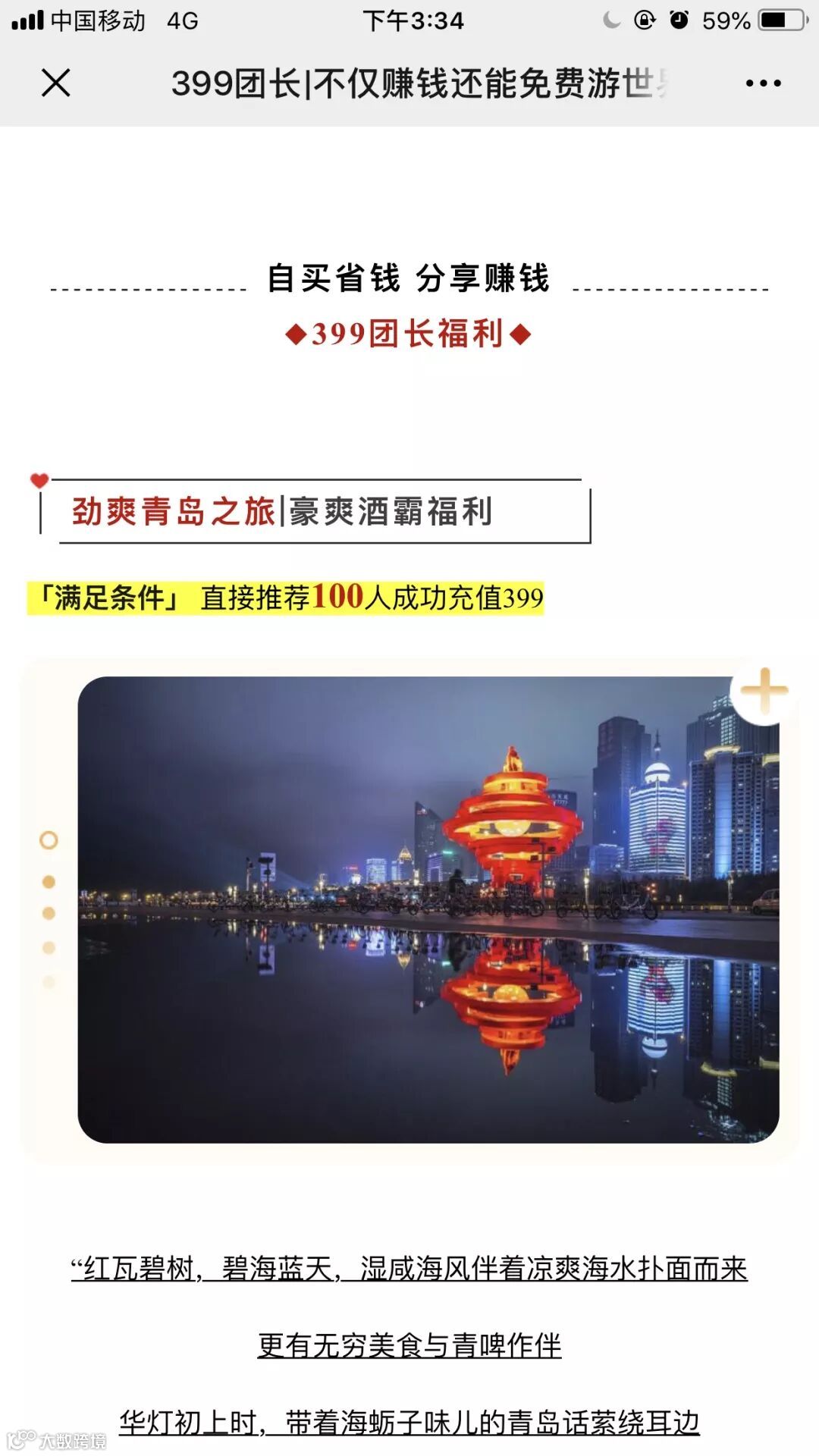 ② 福利:为了激励酒团长裂变推广,青岛啤酒推出“酒团长直接推荐100人购买399,即享受青岛免费游,”“推荐500人三亚游”“推荐1000人德国游”