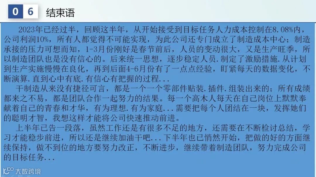 2023年7月15日,高木电子公司召开2023年年中工作总结会议。会上,制造部部长黄家虔汇报上半年的制造部工作情况,并总结“人工成本控制在8.08%以内”的目标任务达成的工作分享、心得体会: