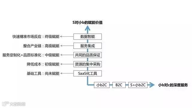 在S2B2C模式下平台提供B端的赋能大体有五类:SaaS化工具、资源的集中采购、共同的品质保证、服务集成、数据智能。