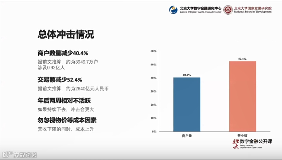北京大学国家发展研究院推算,由于疫情的影响,2020年春节假期期间,我国活跃商户的数量较去年减少40.4%,约3949.7万户,涉及0.92亿人;交易额减少了52.4%,约为2640亿元人民币。我们可以看到,在疫情的冲击下,实体店在人流量、供应链、物价等多种因素的影响下,活跃度、交易量大幅度下降。