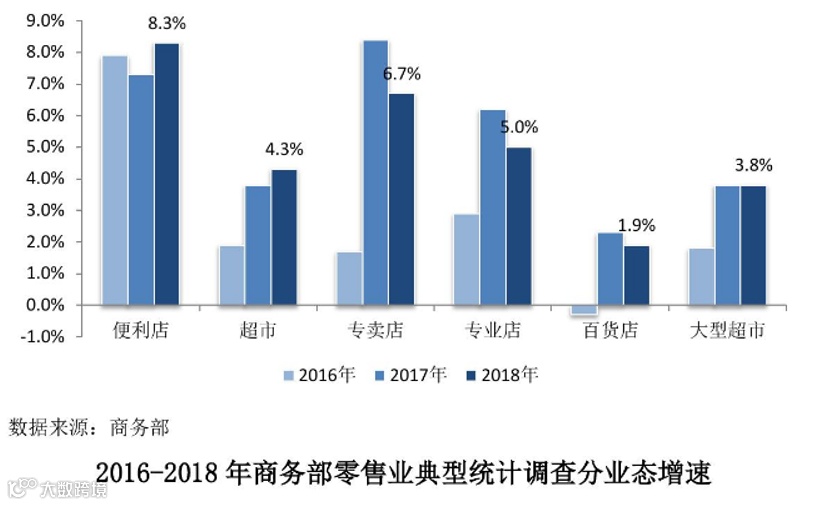 我国的实体零售业的改革,核心的方法论是“新零售”,并已初见成效,商务部发布的《中国零售行业发展报告》显示,2018年便利店、超市销售额同比分别增长8.3%、4.3%,增速比上年分别加快1.0和0.5个百分点,专卖店、专业店、大型超市、百货店销售额同比分别增长6.7%、5.0%、3.8%和1.9%,均为近年来的较高水平。
