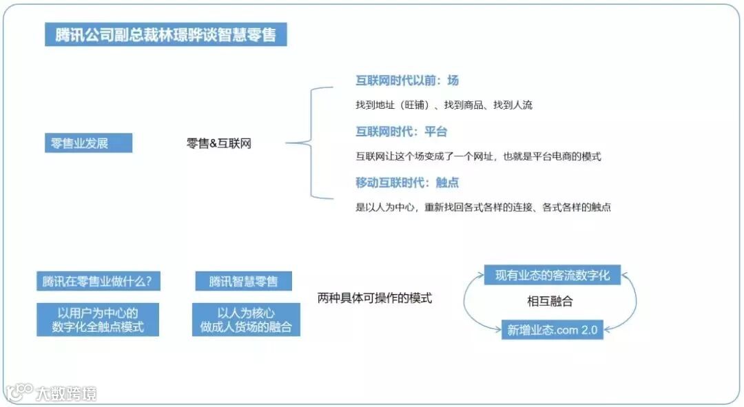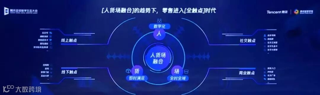 具体而言,线上的触点有来自于物品的,有人社交网点产生的触点,也有来自于商业化的触点,这些触点过去有些存在于实体零售店,有些存在于虚拟店铺中。这些不同的触点,都来自于人跟货,人跟场之间的一个交错。如何将触点重构为以人为核心,与货、场的融合,是腾讯在智慧零售中最重要的理念。