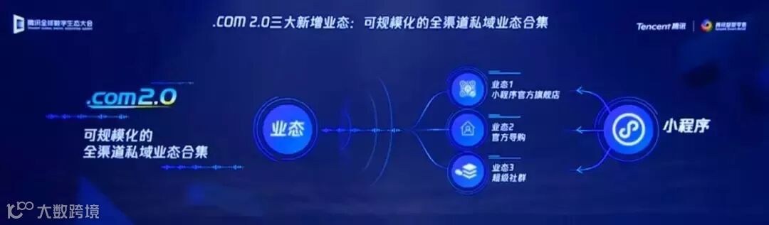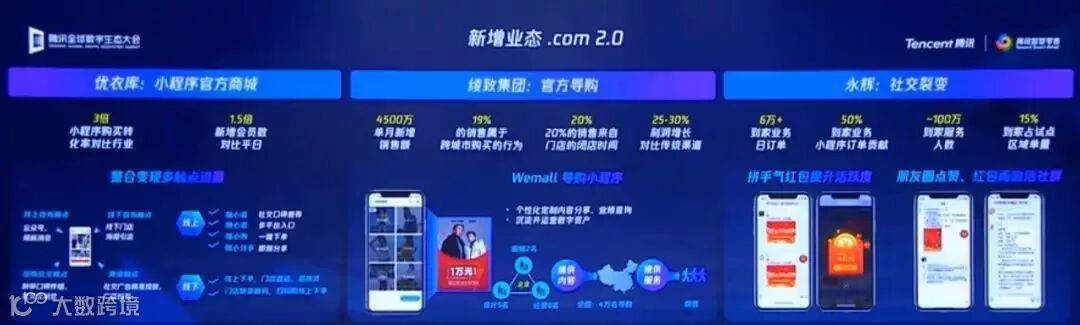 总而言之,腾讯通过多种方式让客流在现有的业态中数字化,让触点进一步产生加成的效果;让触点产生更多来自于线下线上整合的流量。而“.com2.0”,林璟骅则讲述了怎么做线上的延伸,说白了,就是自己的网店。网店不一定非开在平台电商,可以存在很多很多的形式,现在最有效的一个形式是以小程序为载体,以社交为血管而成立的新的“.com2.0”,包括品牌官方小程序、导购、社交裂变等等。