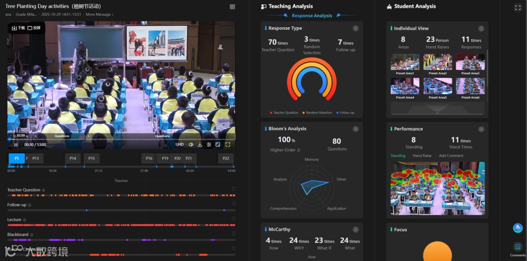 在课堂实施过程中,系统能够实时采集学生行为数据,并生成客观、可视化的课堂反馈,辅助教师精准把握学情动态,实现基于数据的教学决策。在教师专业发展方面,系统通过长期追踪教师的教学能力、教学行为与教研表现等多维特征,开展专业的常模研究,记录周期性教师成长变化,助力教师实现从“经验型”到“实证型”的专业跃迁。