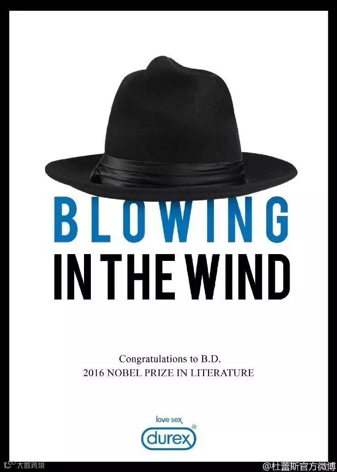 例如杜蕾斯在鲍勃迪伦获诺贝尔奖的热点借势中,把象征着鲍勃迪伦的帽子,通过对顶部进行小小的拉伸,整个帽子在视觉上就具有了杜蕾斯套套使用时的形状,既借了热点的势,又凸显了产品。