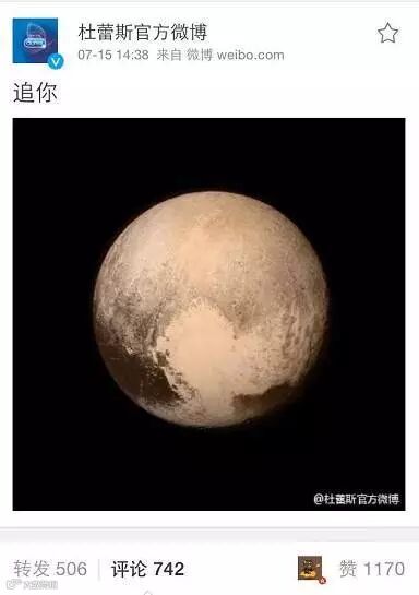 一个典型的例子,就在优衣库事件疯传网络的同一天,其实还有另一则热点事件同样受到网友关注,那就是NASA首次公布了冥王星的近距离清晰照。杜蕾斯放过了优衣库,却抓住了冥王星,当天下午,杜蕾斯官方微博发布冥王星借势文案,以正能量抵制负能量。