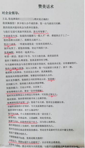不管三七二十一就是一顿夸,更商务一点,还要添加[玫瑰][抱拳][爱心]等表情若干,用以凸显商务舔狗的友好立场。