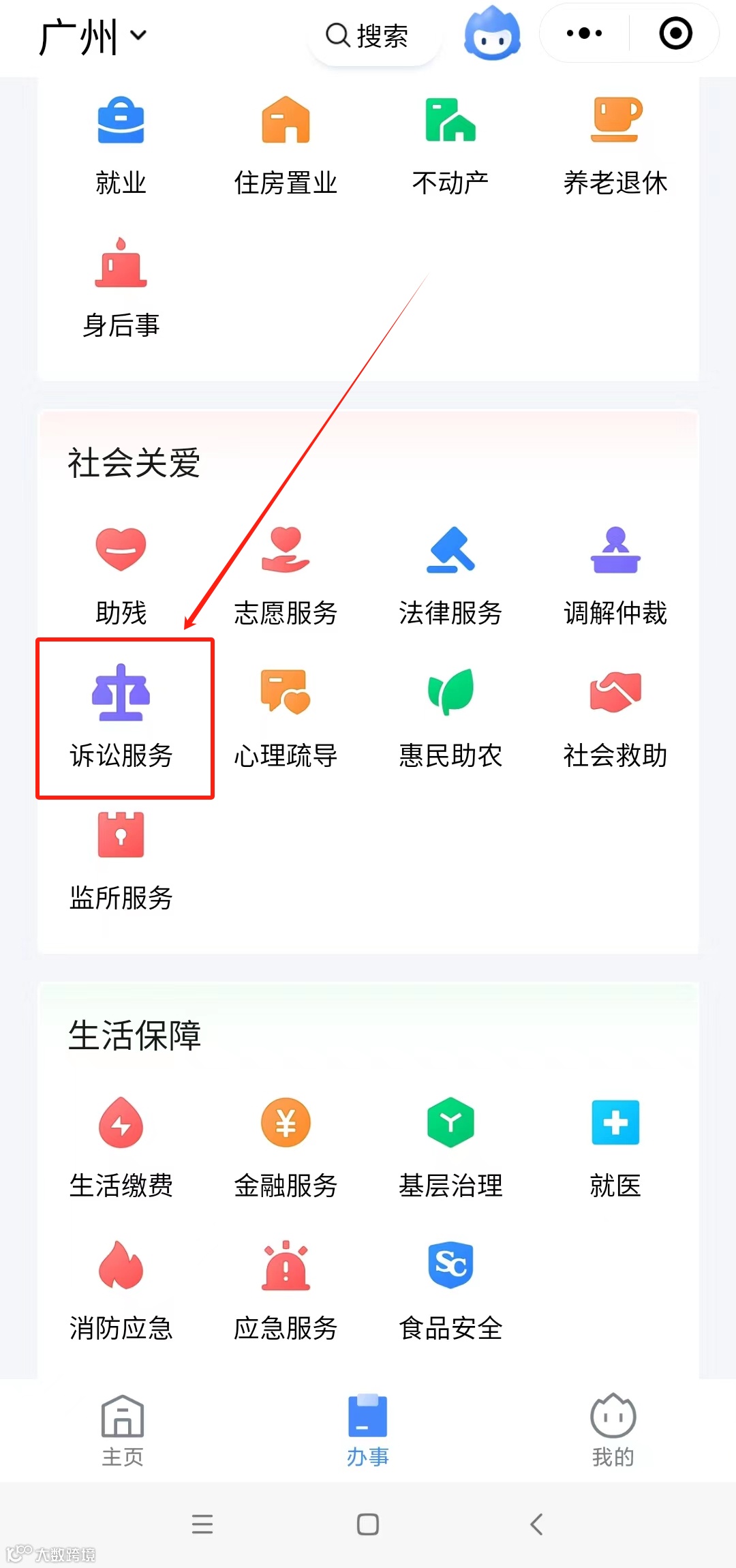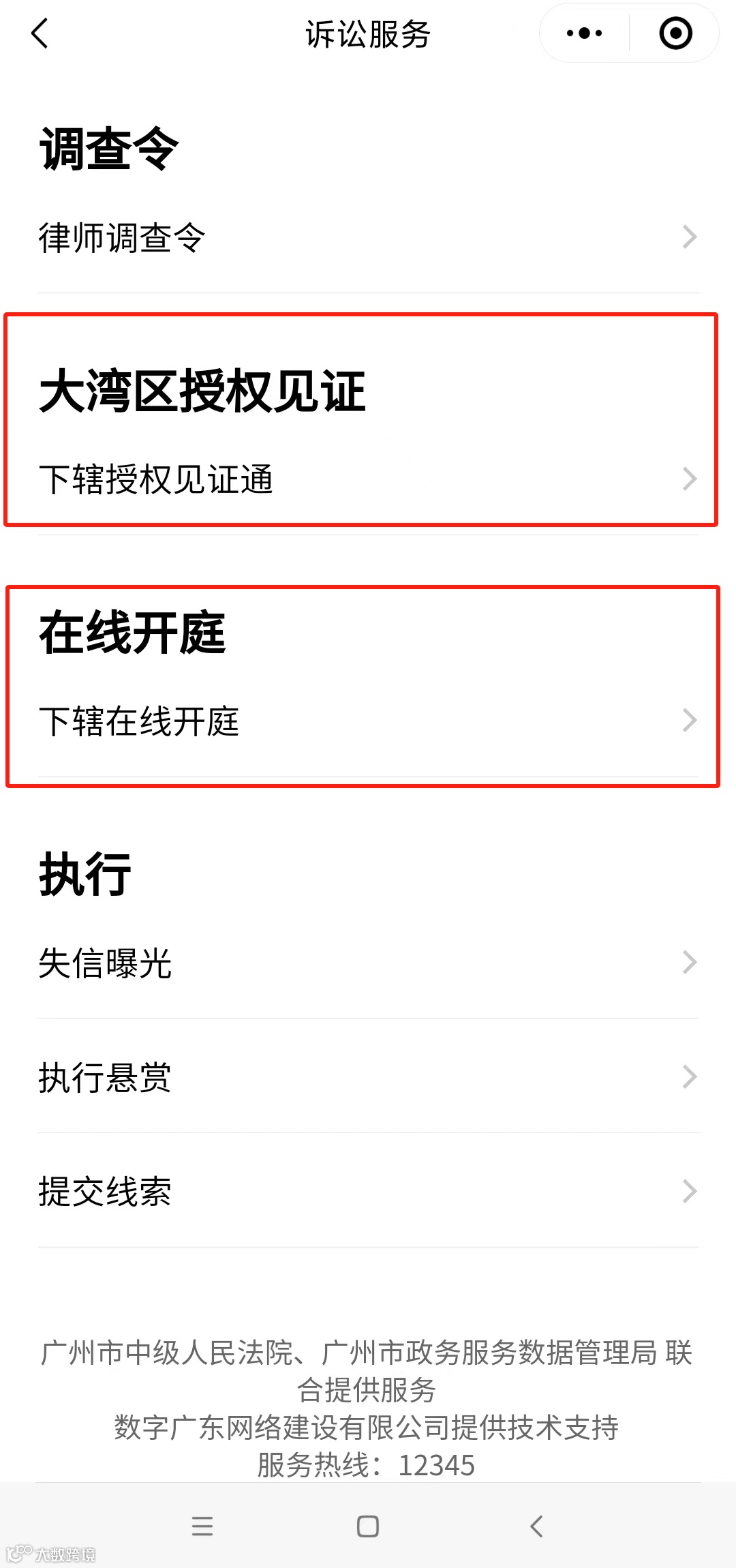 微信搜索“粤省事”小程序,选择“办事”,下滑至“社会关爱”的“诉讼服务”模块,分别点击“大湾区授权见证”和“在线开庭”,完成人脸认证登录后即可分别开启在线授权见证和在线开庭。