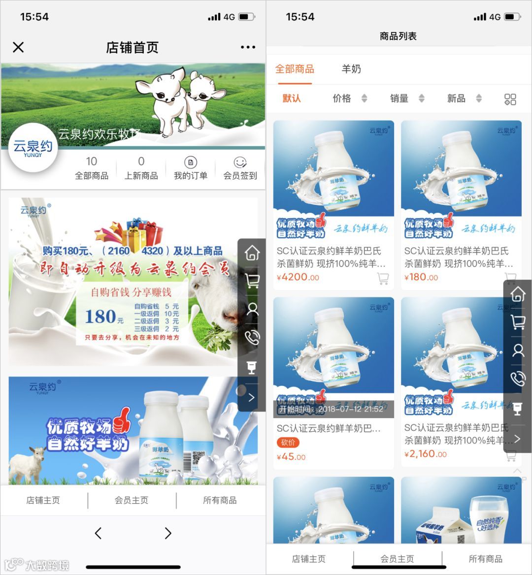 在搭建起分销商城之后,云泉约羊奶并没有选择秒杀、拼团这些引流工具,而是另辟蹊径,不以参与活动的用户数为目标,站在分享产品的角度来开展营销活动。原价18元一瓶的鲜羊奶,一次性购买20瓶只需180元,也就是说,20瓶的羊奶可以由一个人统一购买并分享给身边的家人、朋友。这样设置活动的意义就在于,用户无需拉人就能享受优惠价格,同时在与他人分享的过程中,也起到了口碑传播作用。