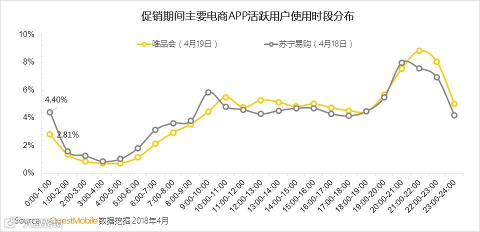 QuestMobile数据显示,苏宁易购、唯品会分别在促销当天出现了3个购物小高峰,分别是0:00-1:00、9:00-11:00、20:00-22:00;说明零点的超级秒购活动有相当的吸引力。