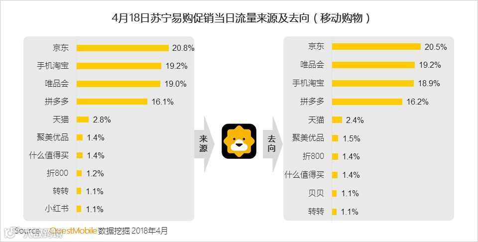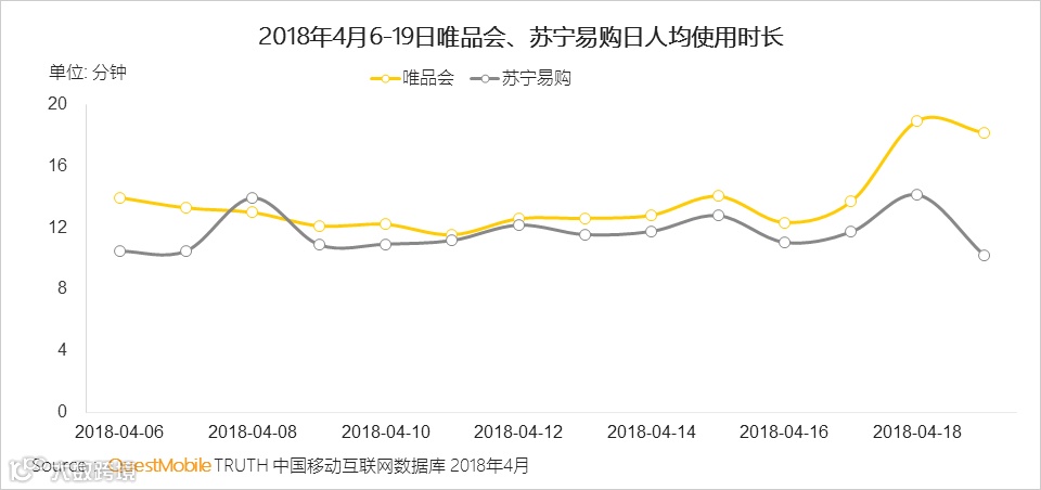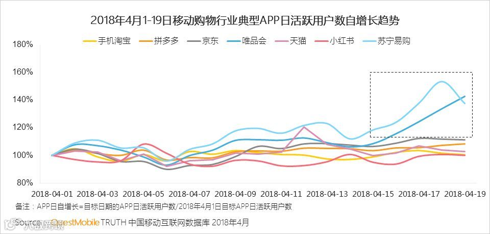 其中,苏宁易购在4月18日DAU比前5日平均DAU增长25%,唯品会在4月19日比前5日平均DAU增长了21%。